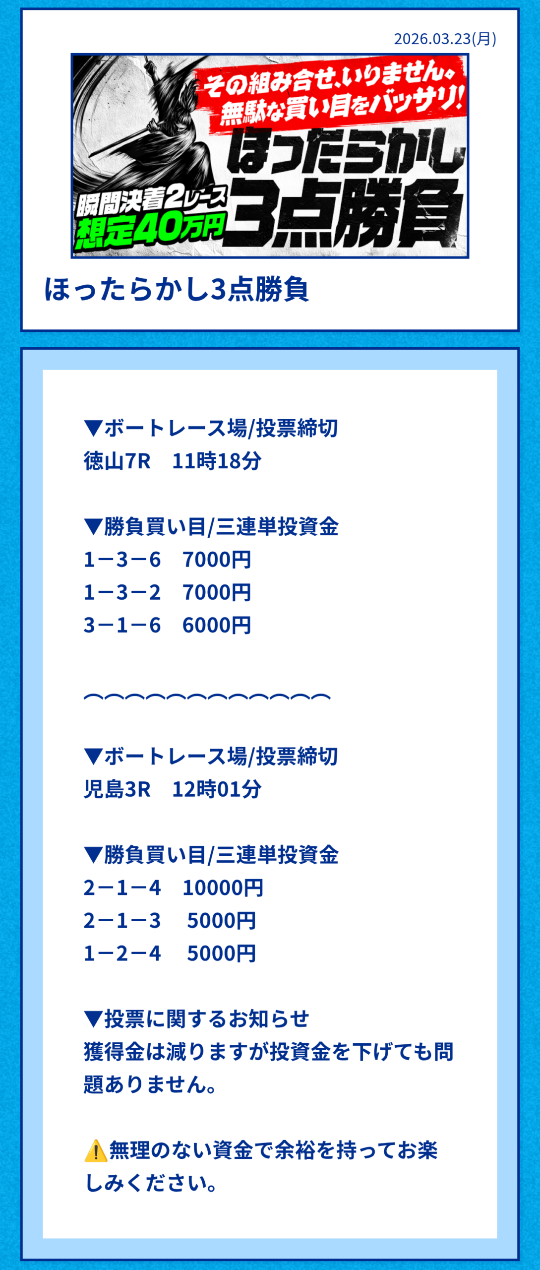 | 3月23日(月) | ほったらかし3点勝負 | 0円 0円 |