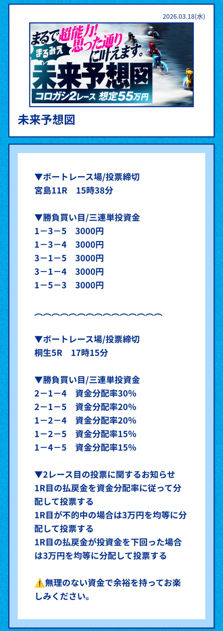 | 3月18日(水)平和島2R | 30,000円 | 59,000円 |